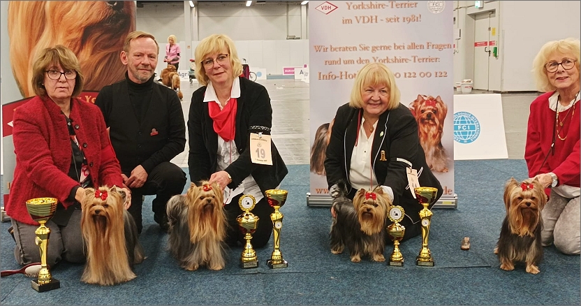 Von links nach rechts: »Marsel Solejl Dior« (1.DYC German-Classics-Winner / Rü / BOB), B: Jutta Neuhold – Herr Michael Thiemann (Richter) – »Jackie Lee of bright Beauty« (1.DYC German-Classics-Winner / Hü / BOS), Z+B: Manuela Hönle – »Kendos Kiss Xtra Sweet Cinderella« (German-Classics-Junior-Winner / Hü / BJH), Z+B: Gisela Köchig – »Uni King Nove Kasio« (1.DYC German-Classics-Junior-Winner / Rü), B: Jutta Neuhold (Foto: Brigitte Lichtenthaeler).