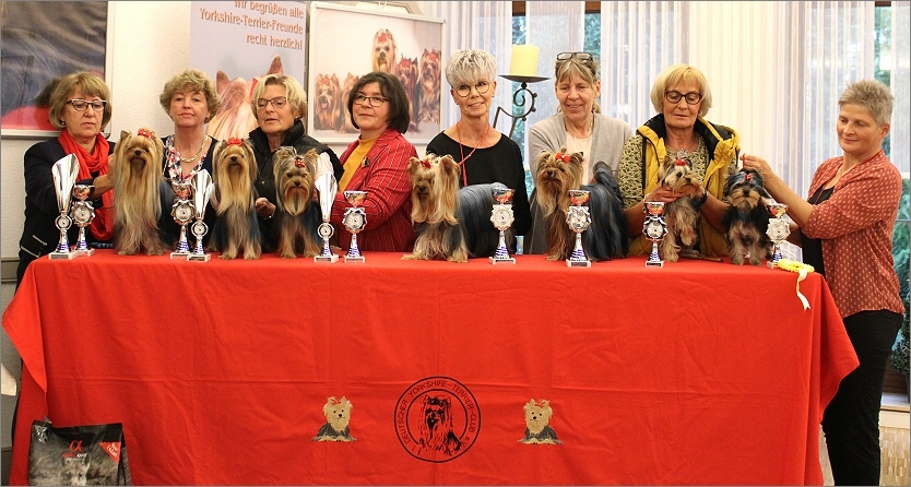 Von links nach rechts: »Marsel Solejl Dior« (BOB), B: Jutta Neuhold – Brigitte Lichtenthaeler (Richterin) – »Marsel Solejl Rumba Dance Fire« (BOS), B: Jutta Neuhold – »Summersby Amamos la Vida« (BJH), Z+B: Nicole Schmid – »Vision of Love Romy« (CAC/H), B: Silke Brandt – »Royal Fireworks Union of Love« (CAC/R), B: Dagmar Bittner – »Bintje of the dreamlike magie wind« (Jüngstenbester Yorkie), Z+B: Ines Schulz – »Blue Miniatures XX Small« (Bestes Baby), Z+B: Sylvia Bernard (Foto: Maik Feldkamp).