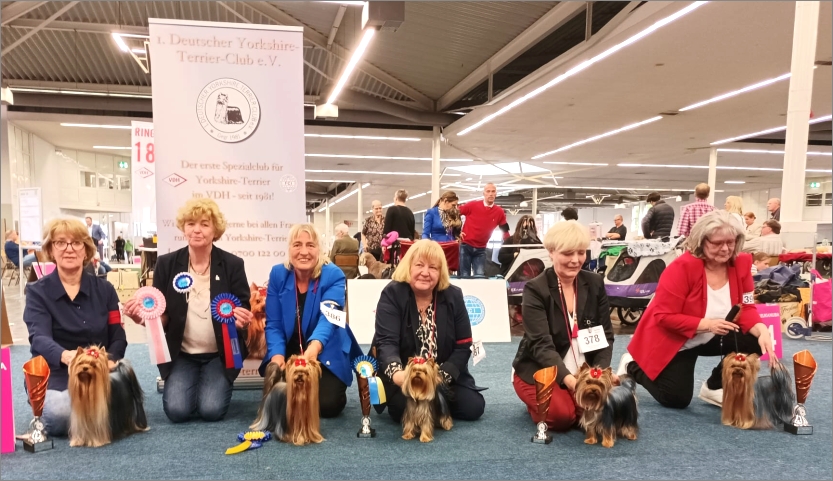 Von links nach recht: »Marsel Solejl Dior« (VDH-Europasieger / BOB), B: Jutta Neuhold – Frau Brigitte Lichtenthaeler (Richterin) – »Tribute to Queen´s French Kiss« (Bester Veteran / BOS), Z+B: Marina Forte – »Bintje of the Dreamlike Magic Wind« (VDH-Europa-Jugendsiegerin / BJH), Z+B: Ines Schulz – »Sunshine´s Angelface Lover Boy Jordan« (VDH-Europa-Jugendsieger), B: Heidi Steffensen-Richert – »Tribute to Queen s Illusion of Time« (VDH-Europasiegerin), B: Sigrid Heinze (Foto: Tanja Gruber).
