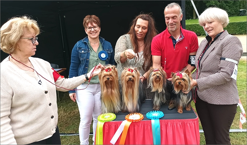Von links nach rechts: »Marsel Solejl Dior« (VDH German-Winner / R / BOB), B: Jutta Neuhold – Frau Tanja Gruber (Richterin) – »Rumba Danse Fire« (VDH German-Winner / H / BOS), B: Jutta Neuhold – »Lovely Heart's Xenia (VDH German-Junior-Winner / H / BJH), Z+B Doris Bergmann – »Sunshine's Angelface Lover Boy Jordan (VDH German-Junior-Winner / R / BJH), Z+B: Heidi Steffensen-Richert / DK  (Foto: Brigitte Lichtenthaeler).
