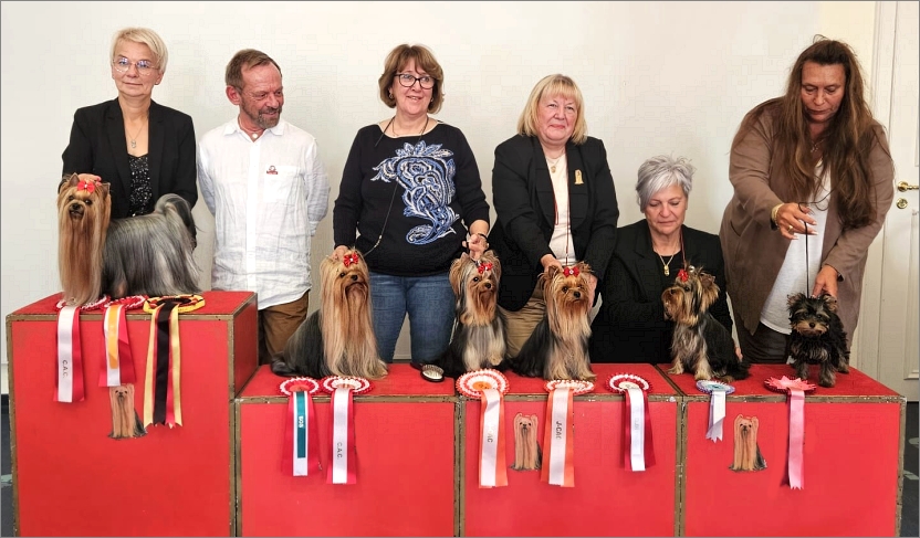 14. September 2024: 1.DYC-Euro-Classics in Aschersleben (v.l.n.r.): »First Love Fancy Diamond (Euro-Classics-Winner / BOB), Z+B: Jacqueline Theilemann – Herr Michael Thiemann (Richter) – »Marsel Solejl Dior« (Euro-Classics-Winner / BOS) B: Jutta Neuhold – »Uni King Nove Kasio« (Euro-Classics Junior-Winner / R) B: Jutta Neuhold – Nike (Euro-Classics Junior-Winner / H / BJH), B: Gisela Köchig – »Kendos Xtra Sweet Cinderelly« (Jüngstenbester Yorkie), B: Gisela Köchig – »Lovely Heart's Zasou« (Bestes Baby), Z+B: Doris Bergmann.