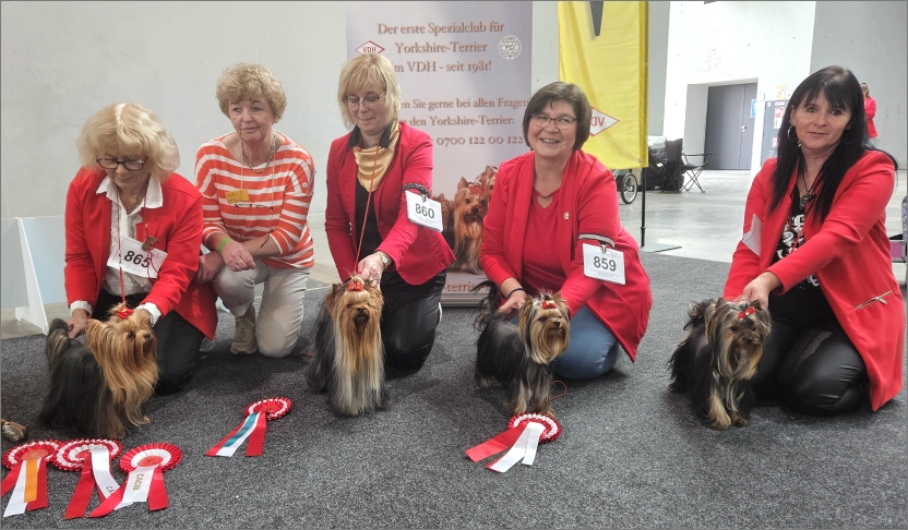 Von links nach rechts: » Helena von Stutenpferch« (BOB), Z+B: Roswitha Becker – Frau Brigitte Lichtenthaeler (Richterin) – »Dazzling Shine Absolute Power« (BOS), B: Kerstin Meyer – »Xania Amamos la Vida« (BJH), Z+B: Nicole Schmid – »You are Special of Bregadoon« (J-CAC-Rü), Z+B: Kerstin Meyer.