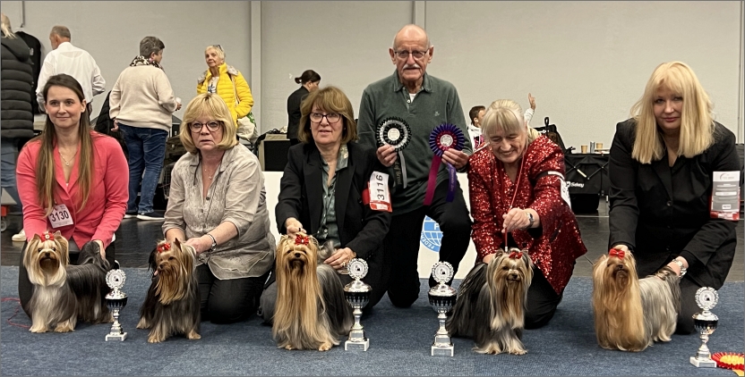 Von links nach rechts: »Pepsi of steel blue Diamonds« (J-CAC / Bundesjugendsiegerin / Bester Junghund), Z+B: Aileen Gerber – »Uni King Nove Kasio« (J-CAC / Bundesjugendsieger), B: Jutta Neuhold – »Marsel Solejl Dior« (CACIB / Bundessieger / BOB), B: Jutta Neuhold – Herr Armin Kriechbaumer (Richter) – »The Only Precious Bonbon« (CACIB, Bundessiegerin / BOS), B: M. Forte, G. Oelsner & Michelle Nagl – »Because I love you Can't Get Enough« (Bundes-Veteranensiegerin / Bester Veteran), Z+B: Hela-Marina Wilke-Honsbrock (Foto: Brigitte Lichtenthaeler).
