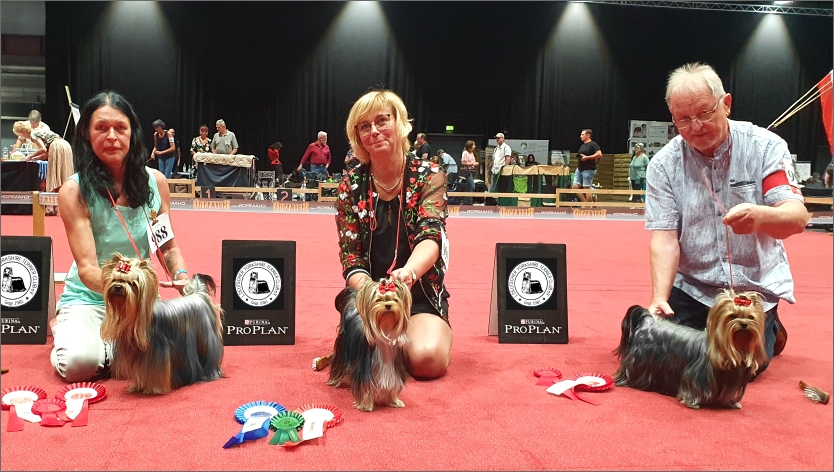 Von links nach rechts: »Power-Boy von der Hummelburg« (BOB), Z+B: Angelika Mosandl – »Jackie Lee of bright Beauty« (BJH & BOS), Z+B: Manuela Hönle – »Lilli-Marleen of Maryon's Home« (CACIB), B: Hans-Joachim Fickardt – Foto: Nicole Schmid.