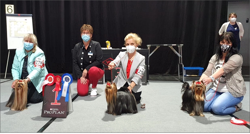 Von links nach rechts: »Tribute to Queen´s French Kiss« (BOB), Z+B: Marina Forte – Tanja Gruber (Richterin) – »Quentin Stribrny Artep« (BOS), B: Jarmila Mlcochova / CZ – »Dazzlingshine Passion Dance« (BJH), B: Kerstin Meyer – (Foto: Beate Seyler).