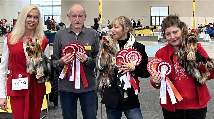 Von links nach rechts: »Bella Helvetica Grace the Movie Star« (BOB), Z+B: Tatjana Schmid / CH – Herr Armin Kriechbaumer (Richter) – »Un Jouet Extraodinaire des Milrols« (BOS), B: Samantha Bruez / F – »Adrenaline for Love of Eve's Amulet« (BJH), Z+B: Eva Szabo / RO – Foto: Marc Alhorn.