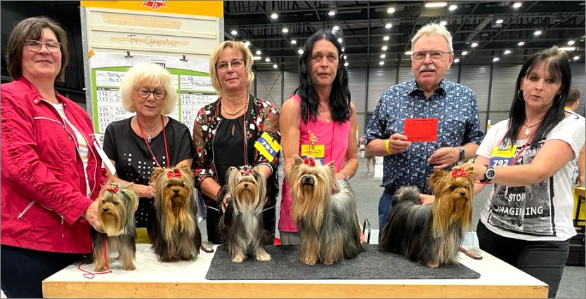 Von links nach rechts: »Summersby Amamos La Vida« (J-CAC)), Z+B: Nicole Schmidt – »Denstail Mark« (CACIB-R), B: Kerstin Meyer – »Jackie Lee of bright Beauty« (BJH), Z+B: Manuela Hönle – »Power-Boy von der Hummelburg« (BOS), Z+B: Angelika Mosandl – Herr Peter Machetanz (Richter) – »Royal Rose of Bregadoon« (BOB), Z+B: Kerstin Meyer.