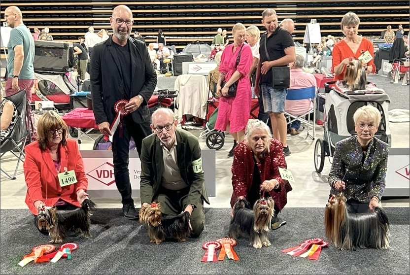 Von links nach rechts: »Porygon Of Perfect Wonderland« (BOS), B: Lene Petersen – Herr Ivo Beccarelli (CH) / Richter – Name des Hundes sowie Z/B wurde uns nicht mitgeteilt – »The Only Precious Bonbon« (BJH), B: Gabriele Oelsner & Marina Forte – »First Love Fancy Diamond« (BOB), Z+B: Jacqueline Theilemann.