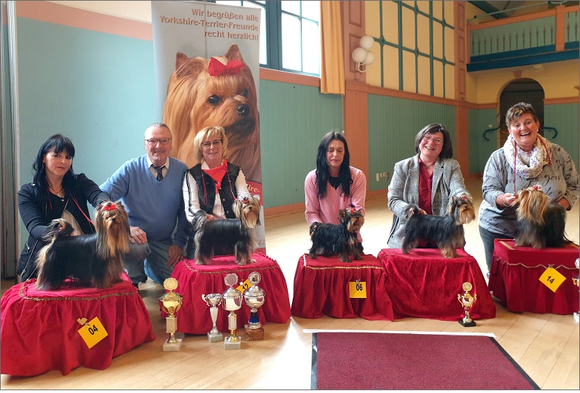 Von links nach rechts: »Denstail Mark« (J-CAC & BOS), B: Kerstin Meyer – Herr Jürgen Grünn (Richter) – »Jackie Lee of bright Beauty« ( BJH & BOB), Z+B: Manuaela Hönle – »Uncle Sam of Bregadoon« (Bestes Baby), Z+B: Kerstin Meyer – »Summersby Amamos La Vida« (Jüngstenbester Yorkie), Z+B: Nicole Schmid – »Dark Pearl from little Lighthouse« (CAC), Z+B: Beate Seyler.