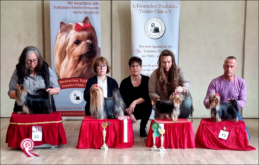 Von links nach recht: »Vin Diesel of Bregadoon« (Rü/CAC), B: Sabine Gräf – »Marcel Solejl Dior« (BOB), B: Jutta Neuhold – Frau Tanja Gruber (Richterin) – »of Morning Sun's Quite Pie Rose« (BJH & BOS), Z+B: Jutta Neuhold – »Lovely Heart's Xenia« (Hü/CAC), Z+B: Doris Bergmann (Foto: Tanja Gruber).