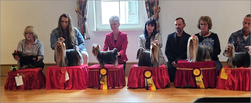 Von links nach rechts: »Lillith of Joranza« (Bestes Baby), B: Sabine Cristiano – »Marsel Solejl Dior« (CAC), B: Jutta Neuhold – »Of Morning Sun’s Quite Pie Rose« (BJH), Z+B: Jutta Neuhold – »Dazzling Shine Absolute Power« (BOS), B: Kerstin Meyer – Herr Michael Thiemann (Richter) – » Rumba Danse Fire« (BOB), B: Jutta Neuhold – »Lovely Heart’s Xenia« (CAC), Z+B: Doris Bergmann (Foto: Brigitte Piros).