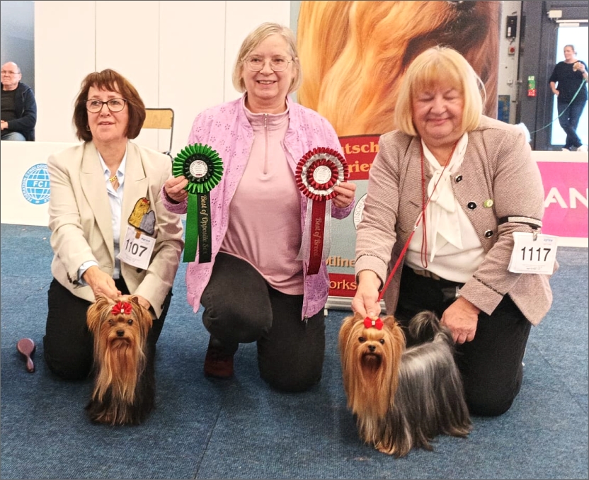 Von links nach rechts: »Mini Morris of Joranza« (Agria Trophy Winner / BOS), B Jutta Neuhold – Frau Gabriele Runge (Richterin) – »Kendos Kiss Xtra Sweet Cinderella« (Agria Trophy Winner / BOB), Z+B Gisela Köchig (BE) – Foto: Brigitte Lichtenthaeler.